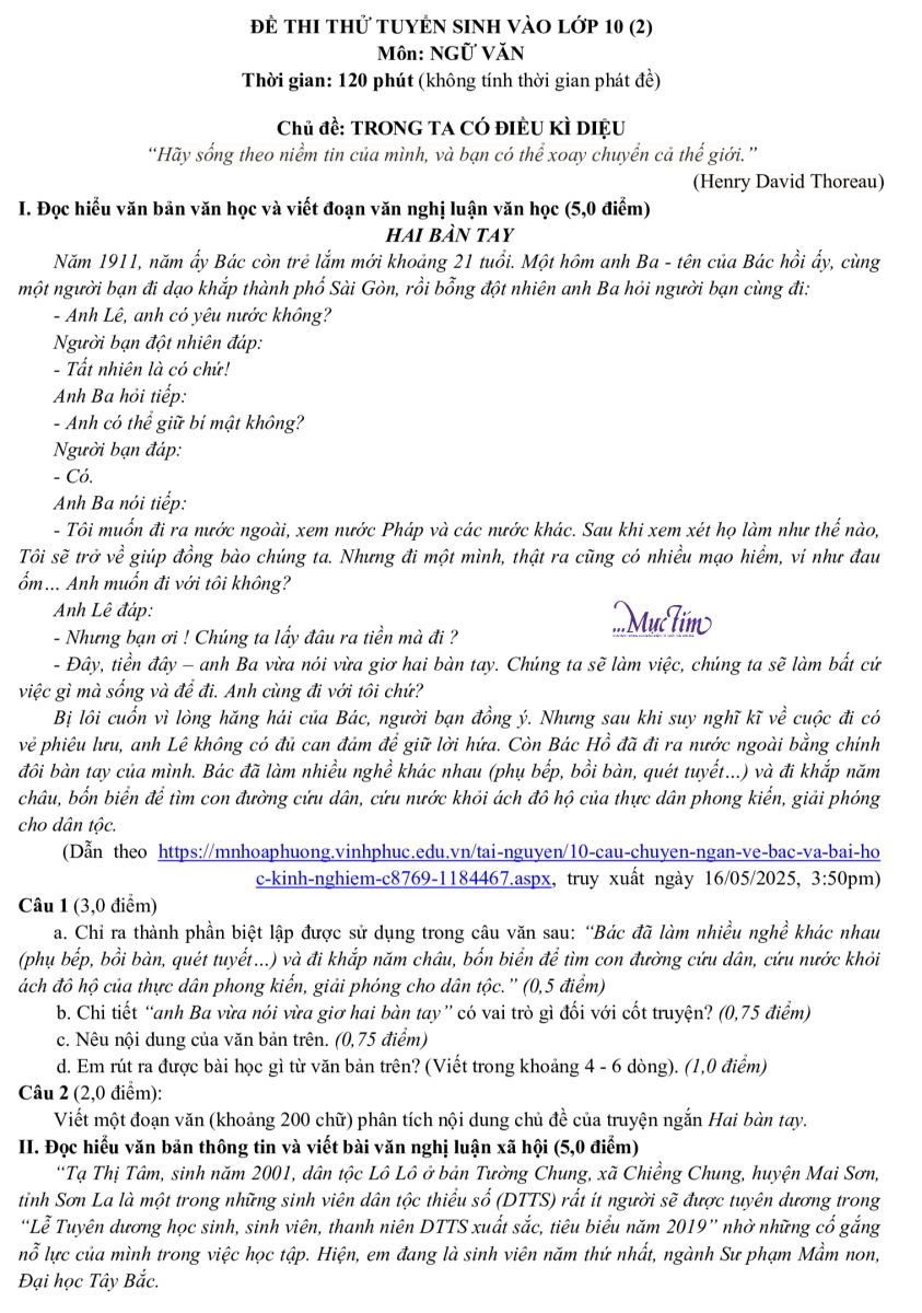 Mực Tím giới thiệu đề ôn tập và đáp án gợi ý tuyển sinh lớp 10 môn ngữ văn, chủ đề 'Trong ta có điều kỳ diệu'.